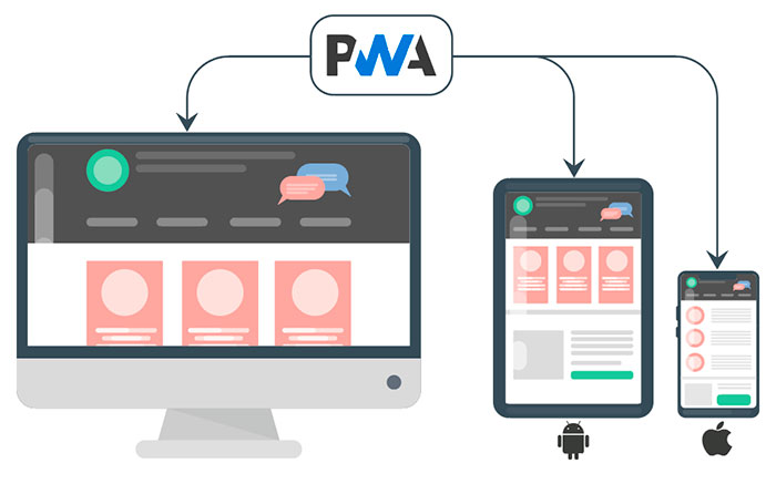 5. адаптивность — PWA подстраивается под любое пользовательское окружение, ОС или браузер;